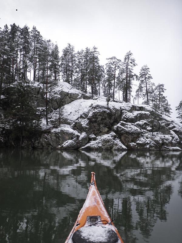 Itsenäisyyspäivän aattona satoi ensilumet. Valkjärvi on vielä vapaana. Itsenäisyyspäivänä vain Lähtelän rannan suojassa oli jonkinlainen jäävyöhyke. Mainio melontakeli. Pari kilometriä vielä, niin tulee täyteen 1200 kilometriä tällä avovedellä. Näillä keleillä avovesikausi voi jatkua vielä.